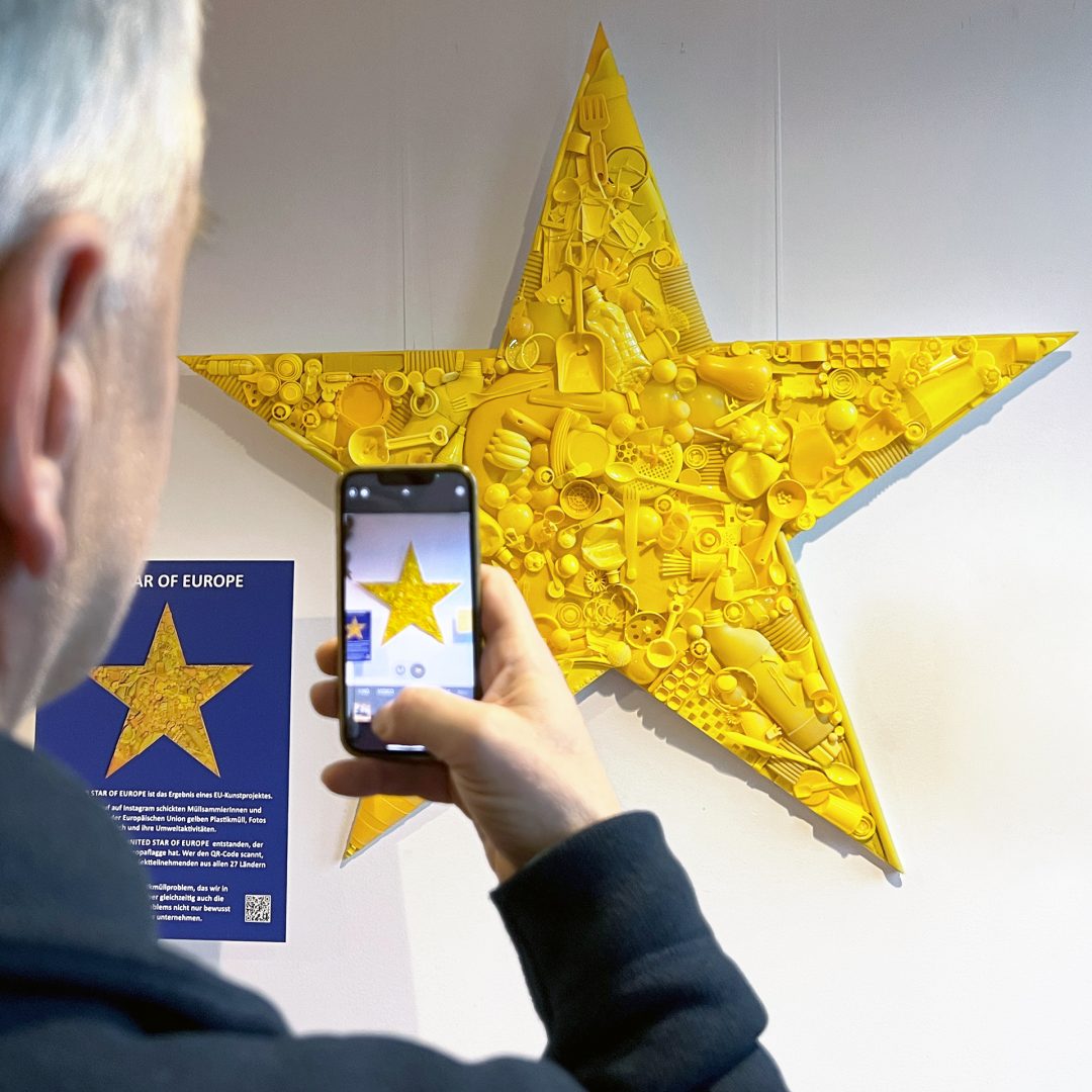 The UNITED STAR OF EUROPE is the result of an EU art project I initiated. Via a call on Instagram, I asked trash collectors and artists from all member states of the European Union to send yellow plastic trash they collected outside (on beaches, in parks, in the mountains, on the streets etc.), photos and a text about themselves and their environmental activities. I used this trash to create the 150 cm x 150 cm UNITED STAR OF EUROPE in the shape of the stars of the European flag. When the star is shown at exhibitions, visitors can use a QR code to access the associated website: https://www.trashmaidberlin.de/PROJEKTE/UNITED-STAR-OF-EUROPE There they will find information about the project and can read and view the texts and photos of the 61 project participants from all 27 EU member states.