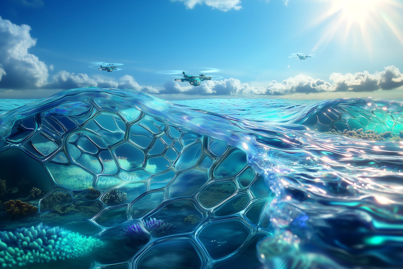 The Blueveil project offers an eco-friendly solution to combat ocean warming. A biodegradable microfabric membrane floats on the water’s surface, reflecting sunlight to reduce heat absorption by the sea. The membrane contains bio-based polymers derived from microorganisms, supporting the natural balance of marine ecosystems and aiding the breakdown of pollutants. Its design preserves the ocean’s blue and controls light absorption, creating mesmerizing geometric patterns on the surface. Deployed and maintained by drones and robots, Blueveil symbolizes a forward-looking response to climate change, merging science and art in the fight for our planet’s future.