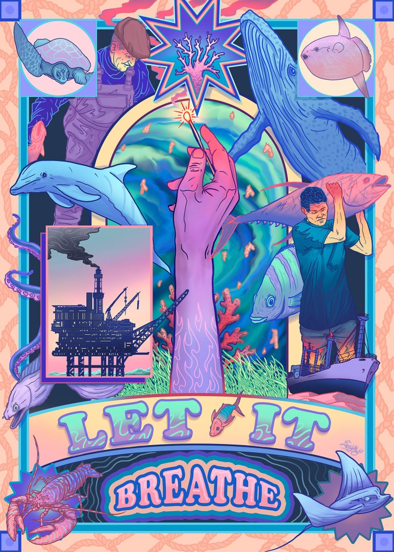 This digital painting explores in a creative and visual way the immense pressure of human activities on marine ecosystems. Often through oil extraction, industrial fishing, and maritime commerce. A human arm rising in the center of the composition holds a match, symbolizing humanity’s role in “setting fire” to the natural balance. This metaphor reflects how our actions trigger a chain reaction, disrupting ecosystems. The artwork calls for urgent awareness and action to restore harmony to our oceans.