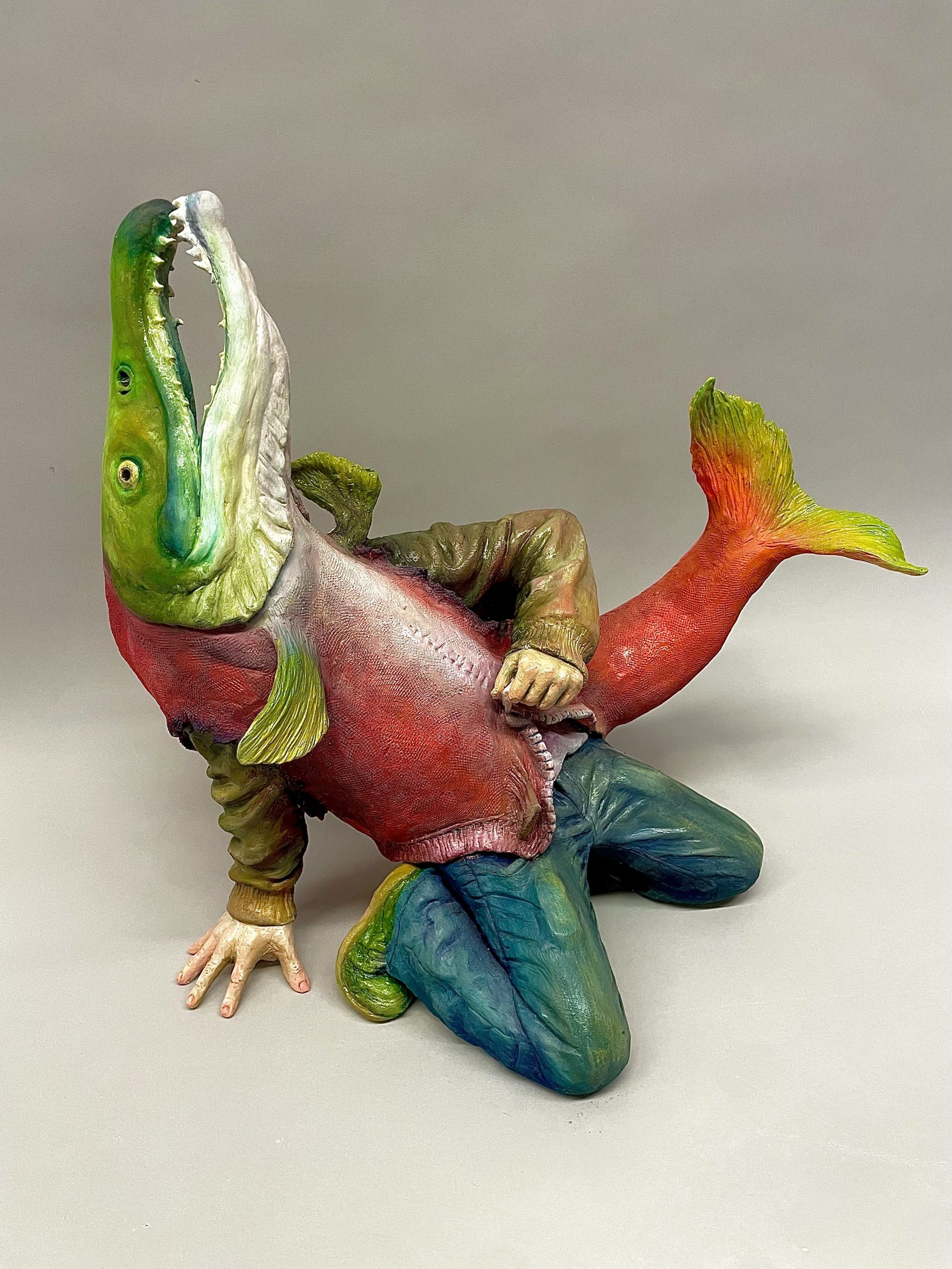 This piece is about human consumption and the current position humans hold in the world. Salmon man shows a man unraveling from his natural state of being. Salmon Man shines light on how we view nature. Often we associate a sockeye salmon with a fillet of fish, forgetting or even uninterested in the true beauty that can be found in the natural form of a sockeye. This piece hopes to educate and change perspective.