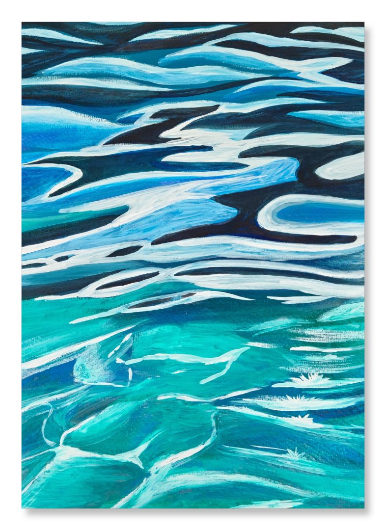 The painting features an inspiring oceanic art. The production technique involves gouache-acrylic painting. To save oceans from plastics. To advertise people about minimalism eco life. To start from small communities, cities and countries. To build eco cities, less plastic. 2024, gouache acrylic on canvas, 27,9 cm x 38,1 cm.