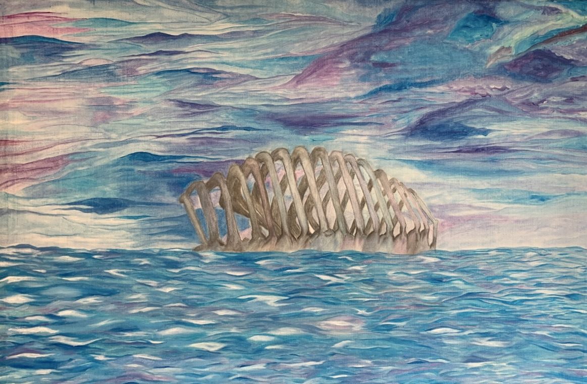 This abstract oil painting unveils the delicate yet destructive relationship between humanity and the marine world. The skeletal ribcage, resembling both a decaying body and a sunken ship, embodies the impact of pollution—where ocean degradation mirrors human fragility. The surreal atmosphere draws the viewer into a space between beauty and loss, urging reflection on our responsibility for oceanic restoration and the cyclical consequences of our actions on marine life and human health. Oil on Canvas 70 x 100 cm