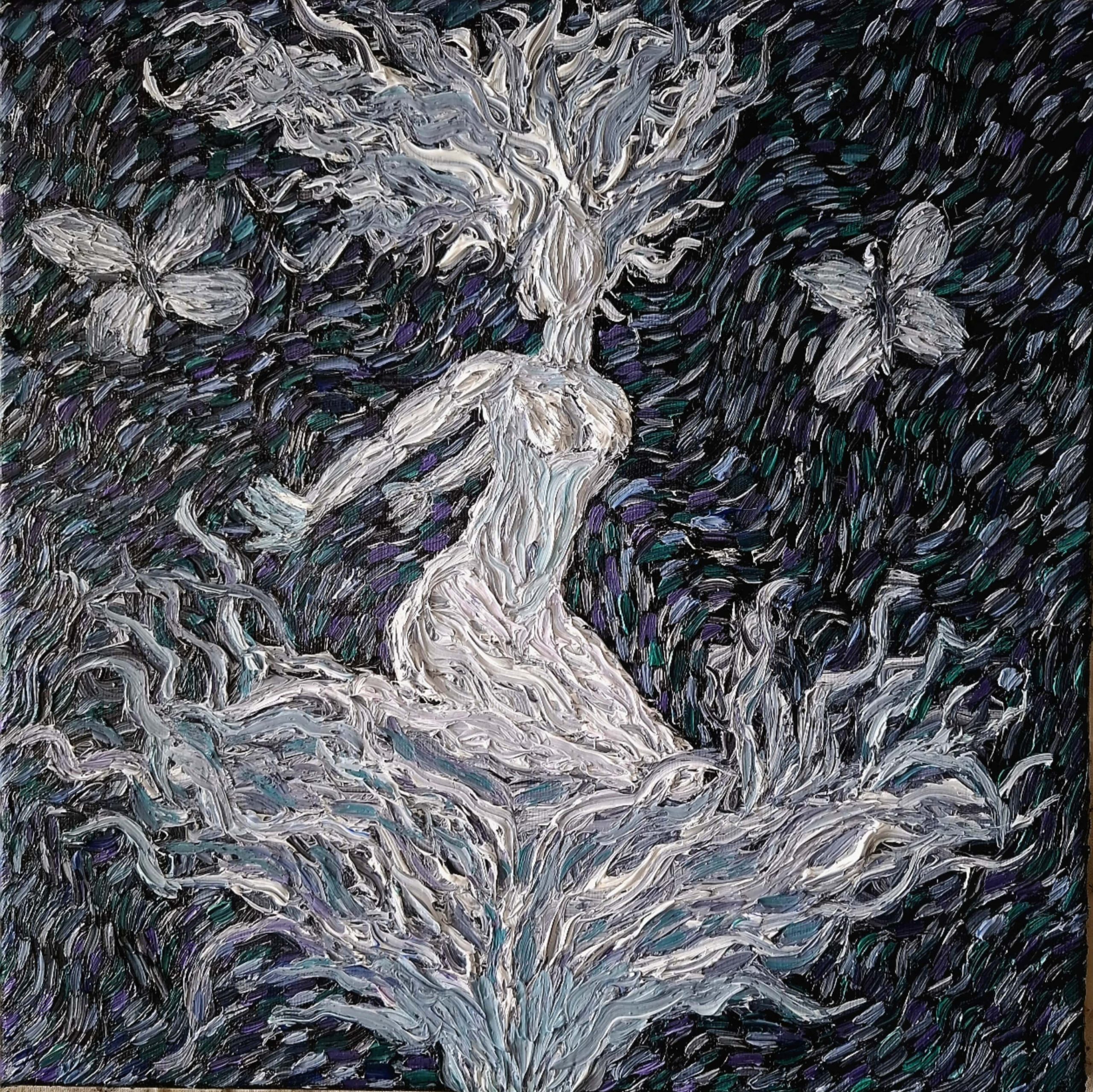 Butterfly Effect embodies the delicate yet powerful interplay between transformation, resilience, and planetary healing. The ethereal figure, fluid in form and identity, represents a celestial guardian of balancea being deeply connected to the cosmic and oceanic realms. Its fiery hair, painted in radiant strokes, symbolizes rebirth, like the sun’s warmth awakening the tides. Beneath its outstretched arms, the ocean swirls in monochromatic vastness, reflecting both the unknown and the potential for renewal. A single vibrant bloom at the figure’s feet stands as a beacon of life, contrasting the vast abyss, signifying the regenerative strength of nature. This piece speaks to the interconnectedness of all living things, mirroring the ripple effect of change where one act of care, no matter how small, can spark waves of transformation across the world. Artist Statement "Butterfly Effect" aligns with the Blue Tribes philosophy, embodying the harmony between celestial and marine forces. The figure represents an ancient guardian of the seas, a spirit of renewal and resilience, watching over the tides that sustain life. Fire and water converge, symbolizing the delicate balance of planetary healing. Through this piece, I explore the interconnected dance of life—how our choices, like a butterfly’s wings, send ripples across the ocean and beyond.