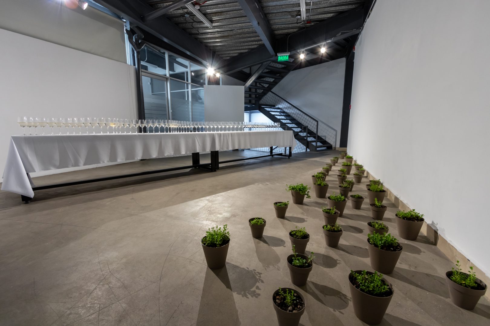 In the globalized world in which we live, there is a great separation between human beings and nature, two concepts that, instead of being distanced, should have a reciprocal and autonomous relationship in favor of life. The central proposal of this project is to rethink the relationship we have with the environment as an inhabited and shared space, specifically with the Machángara River in the city of Quito, Ecuador. The sensorial and reflexive process is an important part of this analysis, therefore, as a starting point, I seek to hold on spiritually to the idea of reciprocity with the environment, taken from the Andean cosmovision as a structure of thought that implements the relationships between species in a reciprocal way within the environment they inhabit. Due to its geographic position, the city of Quito has spread between volcanoes, streams and rivers, and the ecosystems that cross the city are part of the same ecology shared by different human and non-human species. Ideally, the dialogue between all of them would allow an equitable and balanced development of the environment, however, several natural spaces in the city have become garbage dumps, a sanitary problem that is intensified by the little attention paid to the management of waste deposited in the river and the lack of education of a population that has stopped living in a respectful and reciprocal way with its environment. Through the proposed art project, I try to understand the different problems generated by the tensions exerted in this conflictive relationship between the Quiteño community and the river. I seek to communicate the deficiency and incapacity of Quito's society to reach a reconciliation with the river, to stop normalizing its contamination and to be able to promote a sustainable and beneficial environment for all its species. Installation 124 cups with water from the river Machángara and 56 mint plants. 10 x 1 x 1.10 m (table with cups).