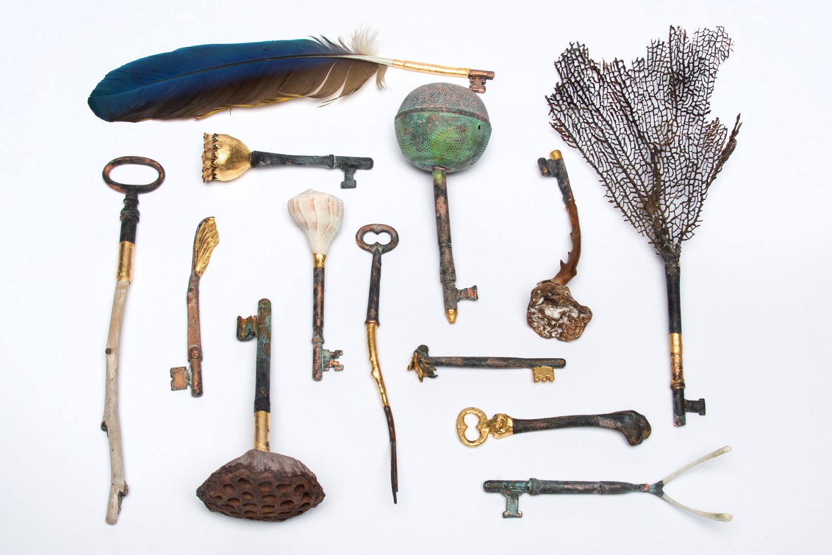 Everything passes and everything stays, but our thing is to pass, pass by making paths, paths over the sea. Antonio Machado, Proverbs and Songs, 1912 Long before humans inhabited the earth, primeval oceans existed. The elemental force of water has both sustained living beings and has shaped the ground upon which we stand. This piece contains keys to unlock our memories and connections to the beginning of our own, or planetary, time. The piece both references and was created by the ancient force of water. The keys are composed of bits of organic detritus that once lived in various oceans. The pieces of sea fans, coral, and plant life have been smoothed by the tides and sand. These elements are combined with antique skeleton keys through an electroplating process. They are a reminder to us of what has come before our species and what may be there after our demise. Scientific data supports that we are in the middle of a 6th mass extinction on earth due to the actions of humans. Perhaps these keys can open our connection to the seas so that we might save them, and us. 1. Rosenberg, K. et. al. (2019) Decline of North American Avifauna, In Science, 19 Sep 2019 • Vol 366, Issue 6461 • pp. 120-124
