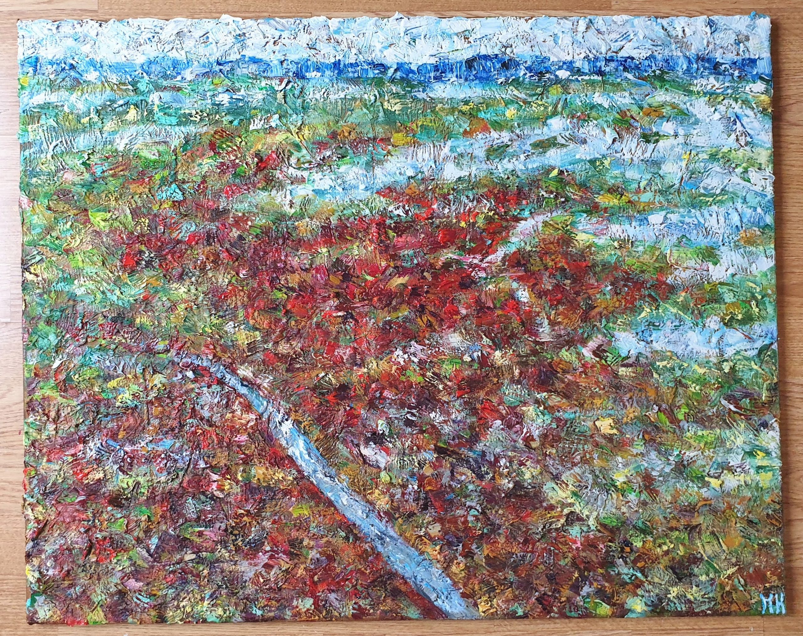 This abstract landscape oil painting depicts a timelapse of the restoration project on Wallasea Island - RSPB reserve in the UK. The newly created saltmarsh, mudflats and lagoons was created from three million tonnes of soil excavated during the creation of the Elizabeth Line in London, which the Royal Society for the Protection of Birds used to raise land levels and create a new 115-hectare intertidal area of saltmarsh, islands and mudflats (known as Jubilee Marsh). It's now a wildlife-rich haven, and the perfect spot for many invertebrates and fish to flourish, and for birds to feed and roost.