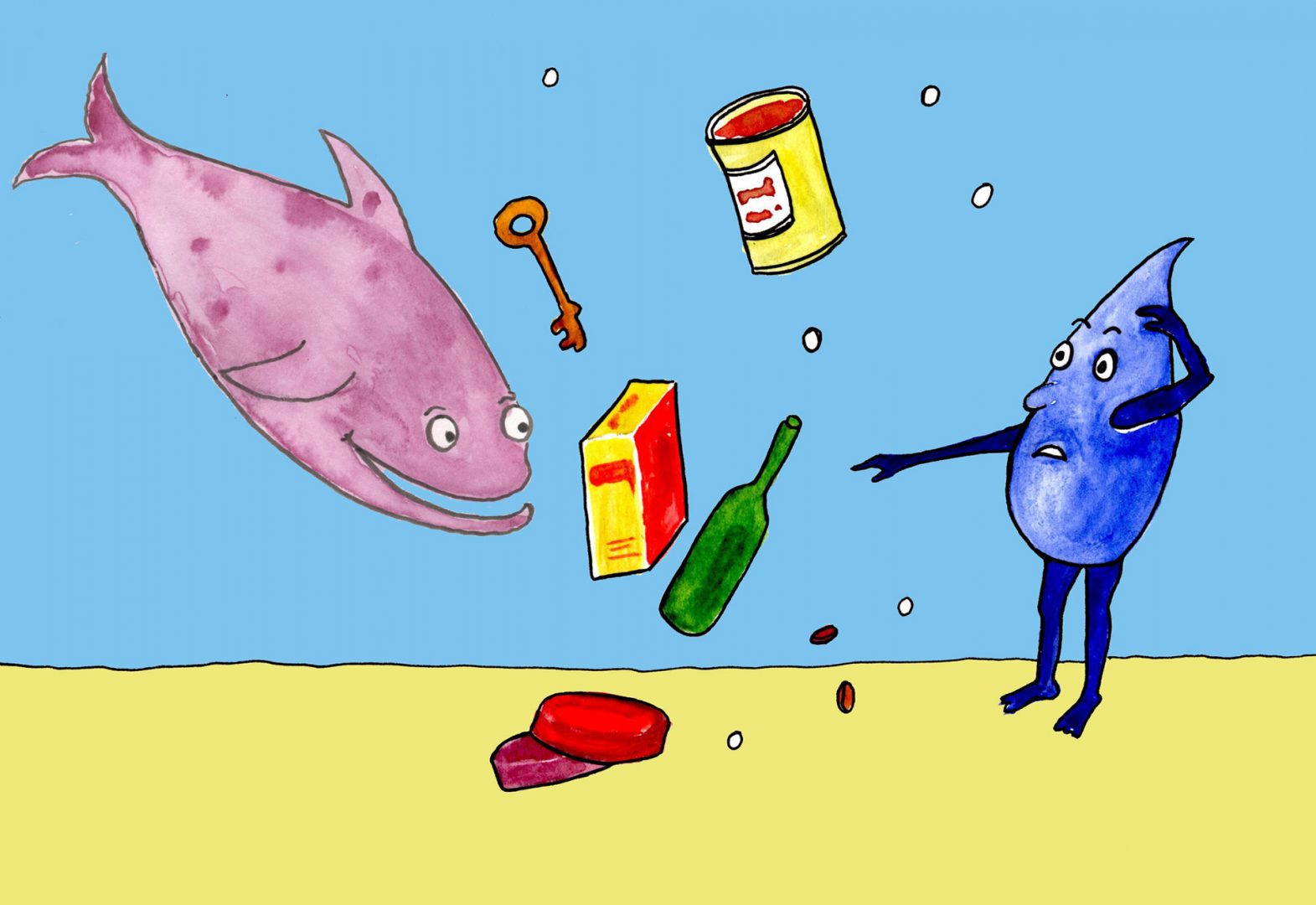 This image is page 3 of a book for children which tells the story of a raindrop and the rain cycle. The reaindrop starts life in the ocean where he notices a large amount of rubbish including bottles and tin can. ' Where Does All this come from ?' he wonders. He friend the fish offers to show him. The rise up to the surface of the ocean where the raindrop is picked up by the wind and carried towards land. There he sees human life and activities. He is carried onwards and eventually falls to earth with other raindrops. He is swept down into a drain and it is there that he sees the rubbish and pollution which will be washed out to sea.