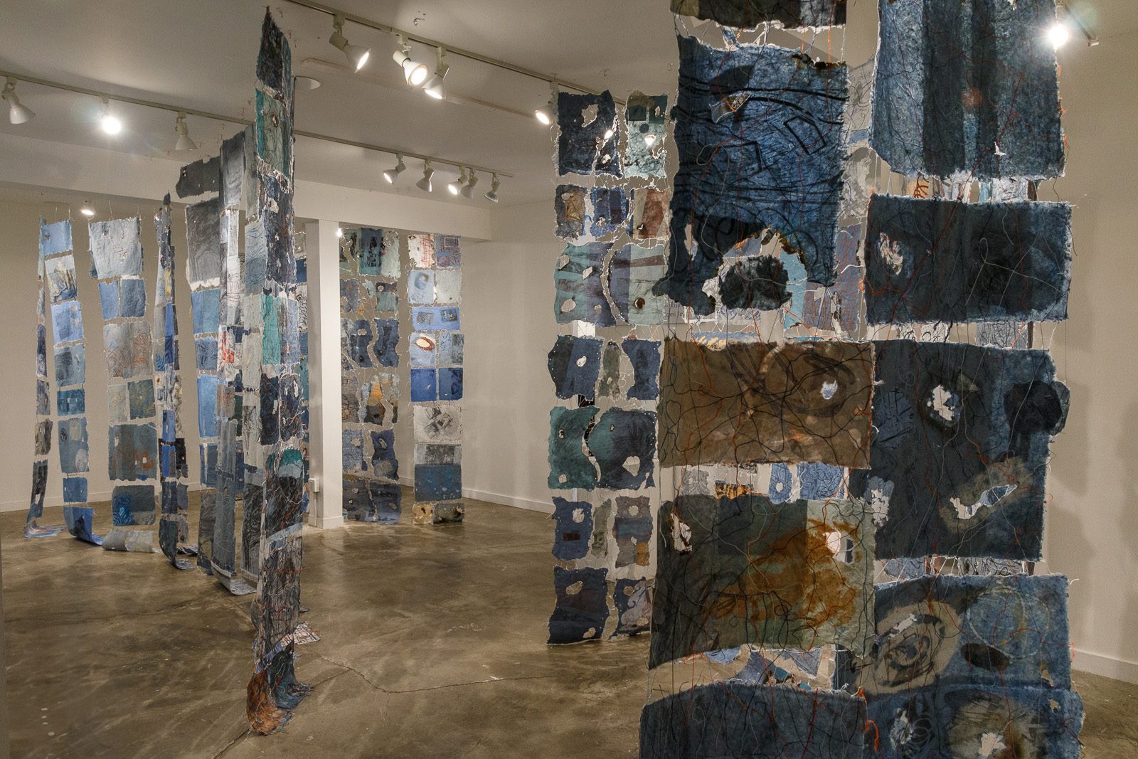 In Deep Water - Rising" is a collaborative art installation focused on water and climate change, environmental issues that are especially affecting Northern California communities. Two Northern California artists, one a papermaker (Jane Ingram Allen) and one a printmaker (Jami Taback), have worked together since August 2021 on this collaborative project, and even in that short time the climate crisis has intensified. To heal the earth and raise awareness the artists present a site-specific installation with community participation that will focus on rising waters and increasing threats from climate change. While Northern California is suffering through a long period of extreme drought and lack of water along with horrific wildfires, climate change is also causing sea level rise along the Pacific Coast and around the world. This installation will raise the alarm about rising waters and rising temperatures and a world in crisis. At the same time, it projects hope for the future using sustainable methods and materials. The artwork shows the terrible beauty and dichotomy of water as it can become out of control and raging, while at other times it is calm and refreshing. Time is running out and the threat rising; we are “in deep water”, but there is hope that we can make important changes and heal the earth. The collaborative artwork produced for this project incorporates several non-toxic printmaking processes on handmade paper created by the artists using plant fibers and a variety of papermaking techniques. Both artists are committed to using earth-friendly techniques and processes. The printed handmade papers are then ripped and burned and joined with natural thread to create a two-sided, multi-part, modular, large-scale art installation to immerse viewers in these immense and pressing problems. It induces a visceral sense of imminent crisis that warns us to change quickly and dramatically. The installation can be viewed from inside as well as outside, and the suspended panels create shadows as wells as paths viewers can walk through to experience the beauty and disaster of the climate emergency. The artwork is primarily in a color scheme referencing water with many shades of blue, gray, white and black and with accents of orange and red referencing wildfires. The artwork makes use of each artists’ area of expertise and takes advantage of unexpected happenings in this artistic dialogue.