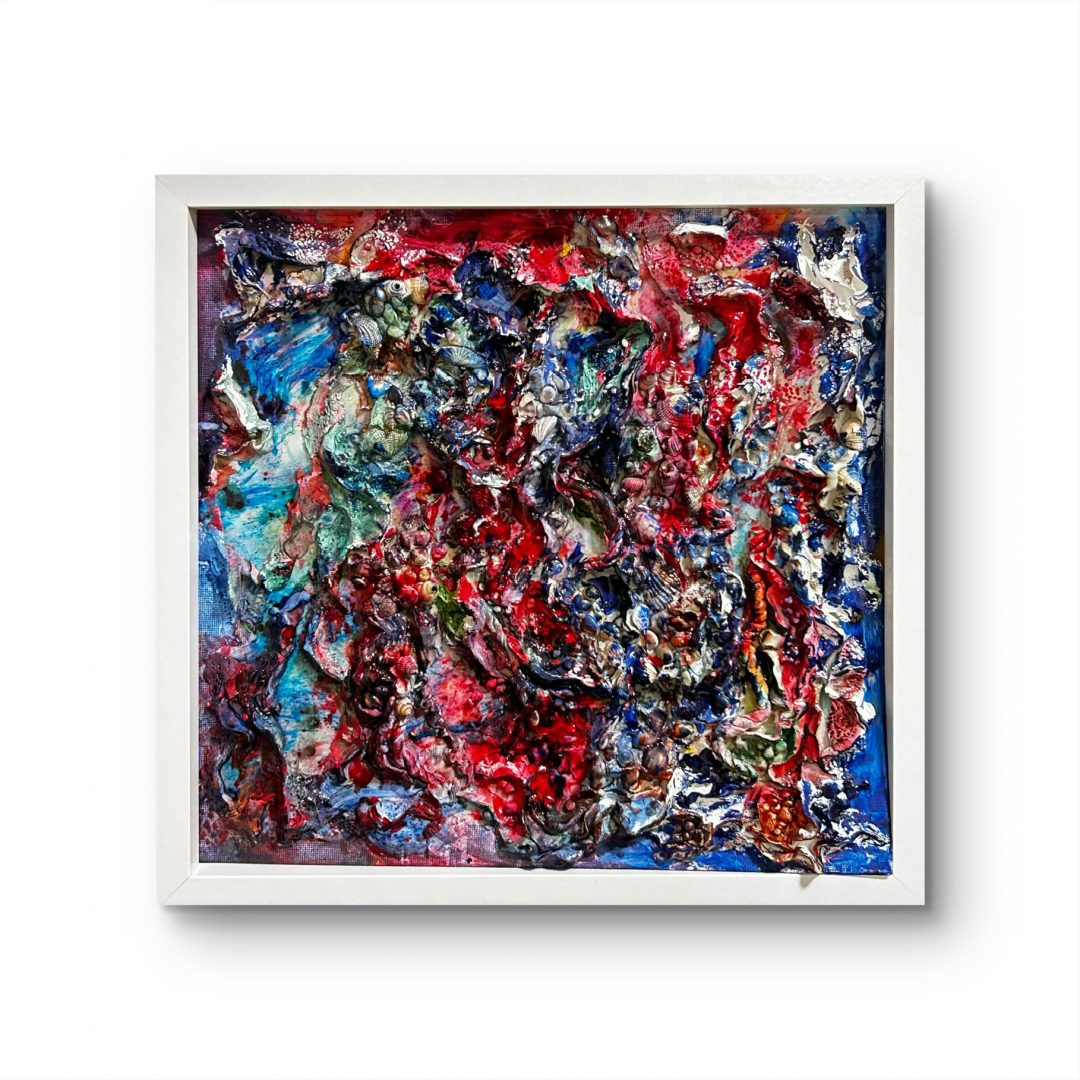 Fragments explores the paradox of brokenness wholeness, while metaphorically reflecting the collapse and reshaping of marine ecosystems. The texture of the piece resembles the eroded structures of marine organisms, as if coral is bleaching, with plastic fragments and sea waves intertwining to form a scene that is both natural and heterogeneous. The visual effects of corrosion, dissolution, and reorganization symbolize how pollution erodes ecosystems, while also hinting at how nature seeks a new balance amidst destruction.