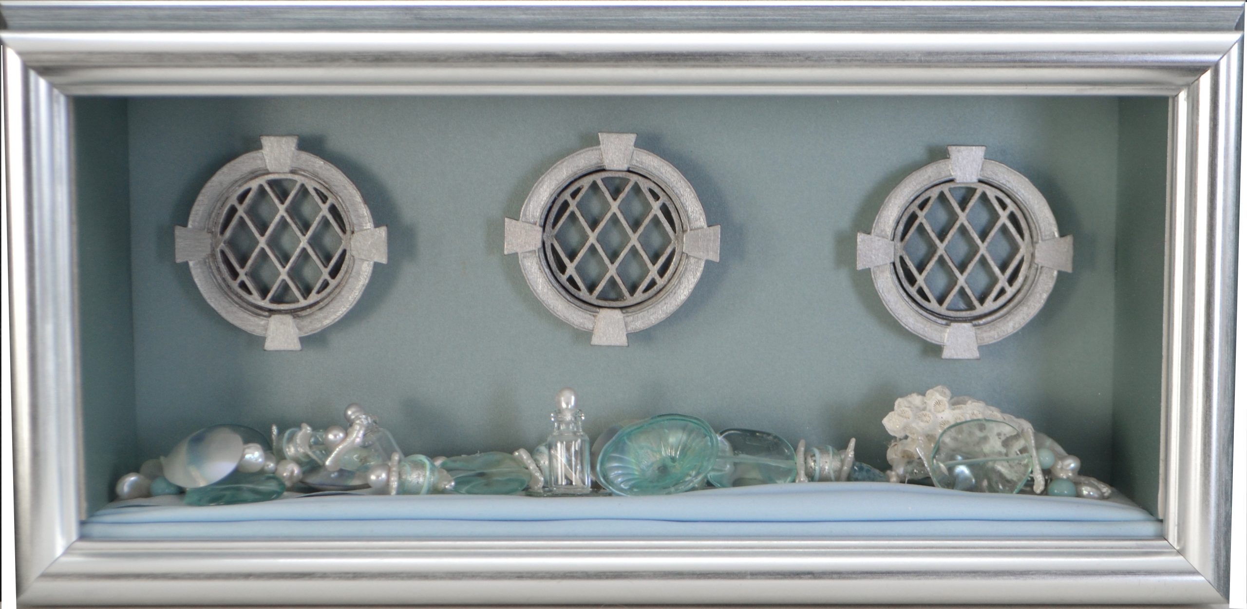 Traditionally, ships in danger sent an SOS ("Save Our Ship"), and persons stranded on a deserted island would put a message in a bottle and set it afloat, hoping that the ocean waves would carry that message to someone who would rescue them. But here, the sender requesting help is the sea itself, where increased acidity and rising temperatures have weakened many forms of marine life. This small (7 x 14 x 4 inches) mixed media work consists of aquamarine, hemimorphite, freshwater pearls, Murano glass, fabric, acrylic paint, mirror, glass, cold water coral, dollhouse miniatures, and a deep custom wood frame with museum glass. To accompany the exhibit of this small-scale assemblage, I envision creating an installation consisting of empty bottles into which visitors can insert messages of support for protection of the oceans, as "SOS" can equally be interpreted as "Save Our Seas".