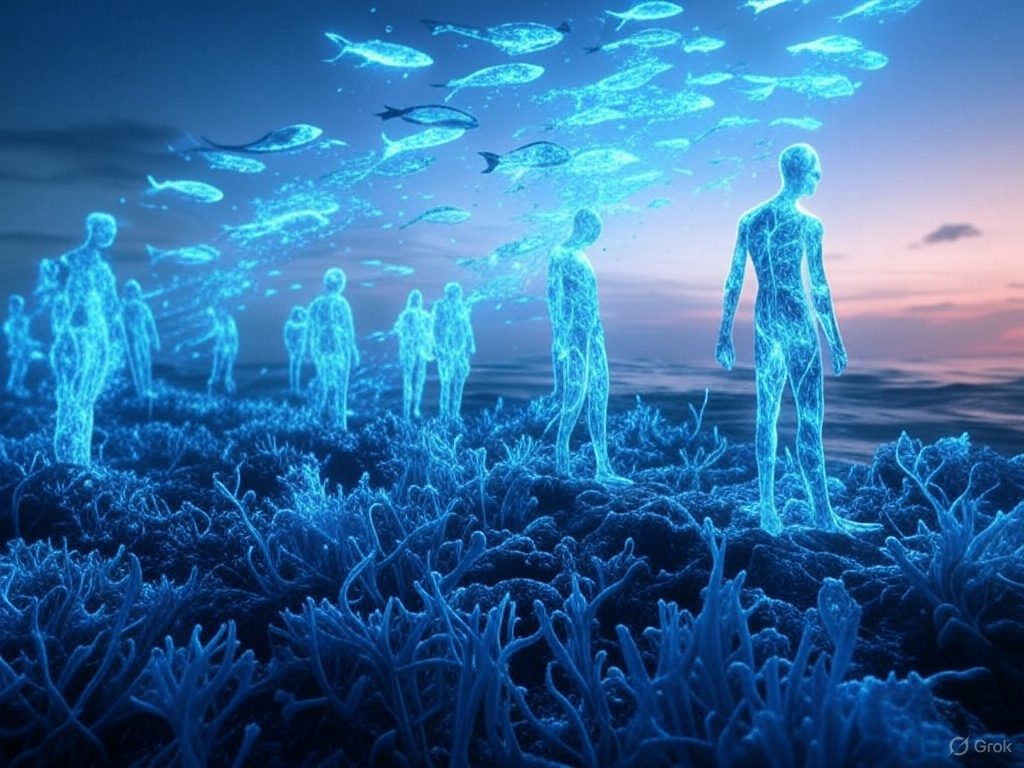 Depicts a futuristic ocean where human figures with translucent, vein-like circuits pulse blue, merging with schools of fish in a radiant dance. Their bodies dissolve into streams of data that purify a toxic, oil-choked sea, transforming it into a crystalline expanse teeming with alien-like coral. The background pulses with electric hues—neon indigo to searing cyan—symbolizing technology’s role in healing. The Blue Tribe is a cyber-organic alliance, rewriting planetary fate. Its stark, glitchy aesthetic and luminous details scream innovation, demanding attention as a radical vision of coexistence and ocean restoration.