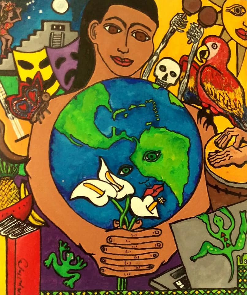 My painting is a celebration of planetary healing, bursting with color, movement, and life. At the center, an Indigenous woman cradles the Earth, holding it close as if to nuture, to protect and restore it. The Earth´s oceans are deep and blue, carrying both the sorrow of past damage and the hope of renewal. Symbolism abounds in the piece art, music, acting, and dance flow through the scene, blending with nature—flowers bloom, a bee hovers, a skeleton stands as a quiet reminder of both loss and rebirth. Insects, reptiles, and a bird are integrated in painting, part of the same rhythm as the stars and moon; night versus the gloden dayligh of the sun above. Ancient architecture, astrology, literature, and drama surround the woman and the natural world, showing how culture and nature are inseparable. In the right hand corner a lap top is present, giving a wink to technology today too. The piece pulses with energy, a reminder of healing is possible when we respect, honor the Earth´s oceans and the culture which spring from a healthy, happy planet .