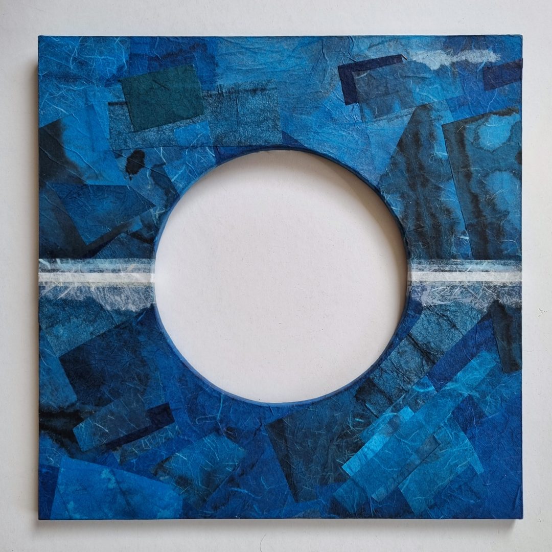 At the center of The Blue Around Us lies an absence—an empty circle that draws the viewer in. This missing core creates an unexpected tension: why is there nothing in the center? The artwork, immersed in deep blue tones and divided by a horizon, symbolizes the ocean and sky—elements that unite us beyond borders. Yet, the void at its heart asks us to step into the emptiness, to recognize our presence within the vast ecosystem that surrounds us. We often forget that we are part of this equation—that we must look around, acknowledge our impact, and act to protect our fragile blue planet. Through layered indigo-dyed paper and the ancient Shibori technique, this work invites introspection and a shift in awareness.
