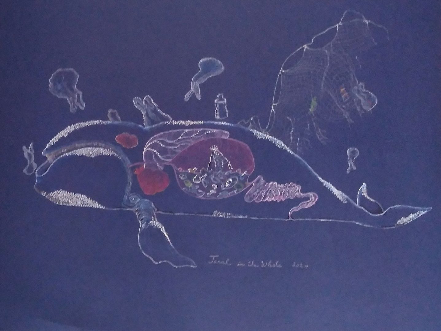 Pencil on blue paper A man eaten by a whale finds he is in a stomach filled with plastic debris, discarded nylon fishing nets, plastic bottles etc. He raises his hand from the heap of rubbish.