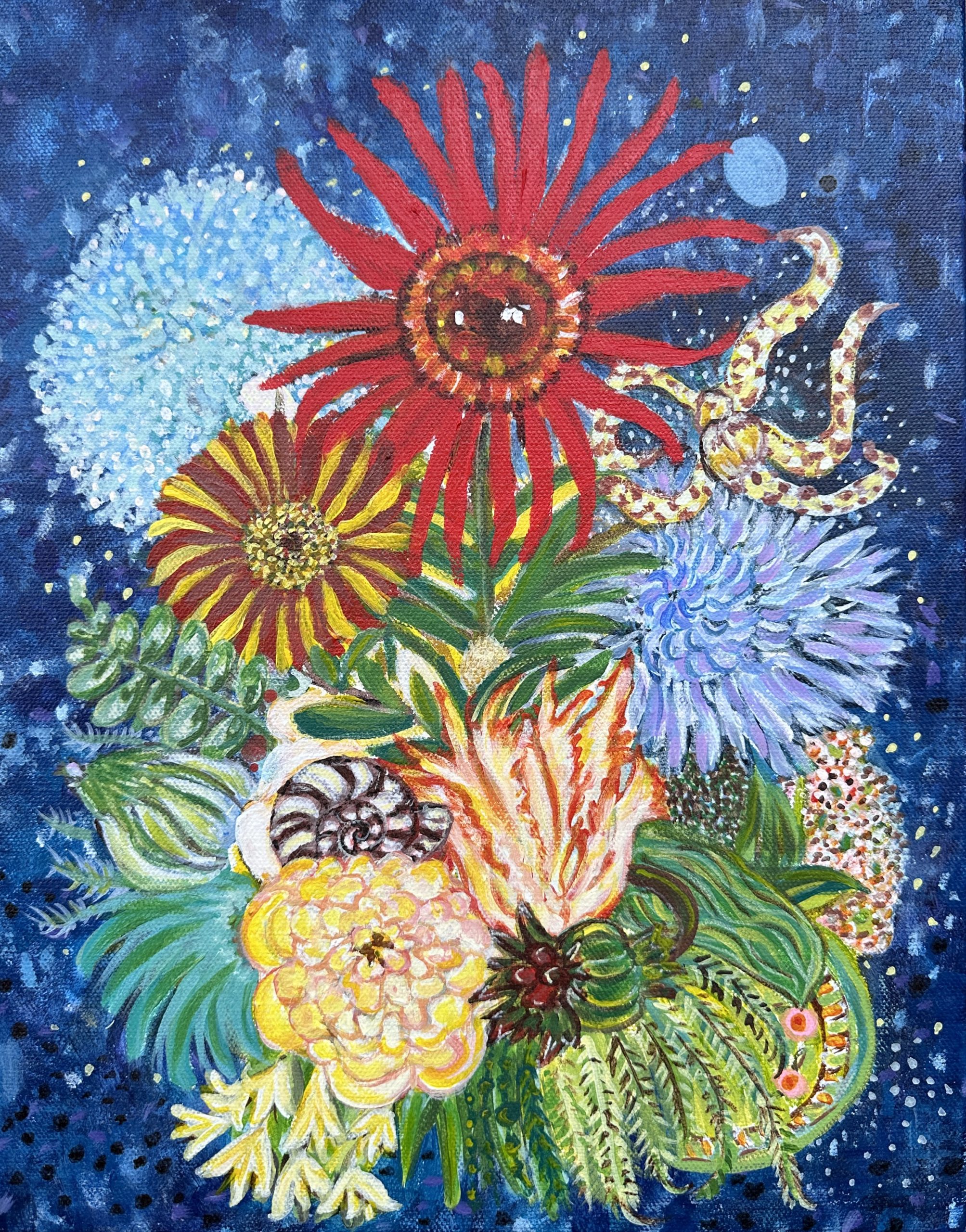 All of my work has some kind of embedded symbolism that references the natural world. This painting "Sea Star" came about when I learned that the sunflower red sea star was in danger of becoming extinct because rising ocean temperatures. 11" x 14" acrylic on canvas