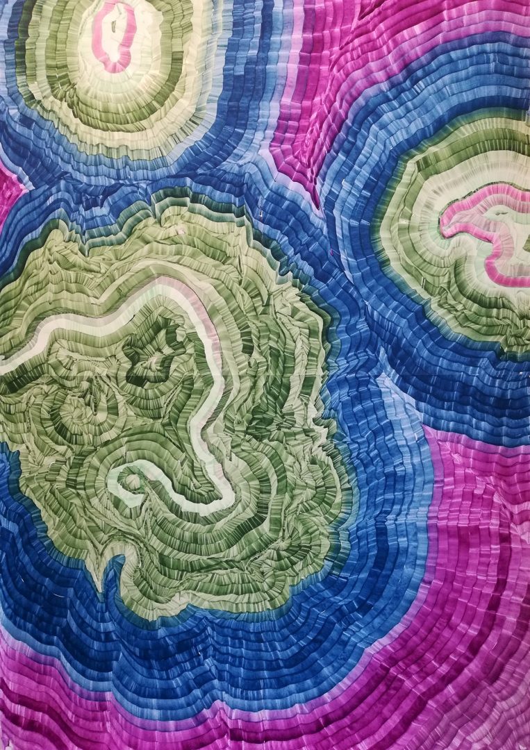 200x140cm, Acrylic on 4 joined papers. This piece reflects the delicate balance between oceanic and terrestrial ecosystems. The deep blues and purples evoke the movement of water, currents that shape life, while the vibrant greens symbolize marine vegetation like kelp forests and seagrass meadows, silent healers of our oceans. These natural filters produce oxygen, absorb carbon, and shelter marine species, yet they are increasingly at risk. The layered, rhythmic forms mirror both geological time and the unseen forces shaping our planet. As the tides shift, so does the fate of these ecosystems. Will we allow nature to restore itself, or will we disrupt its fragile harmony?