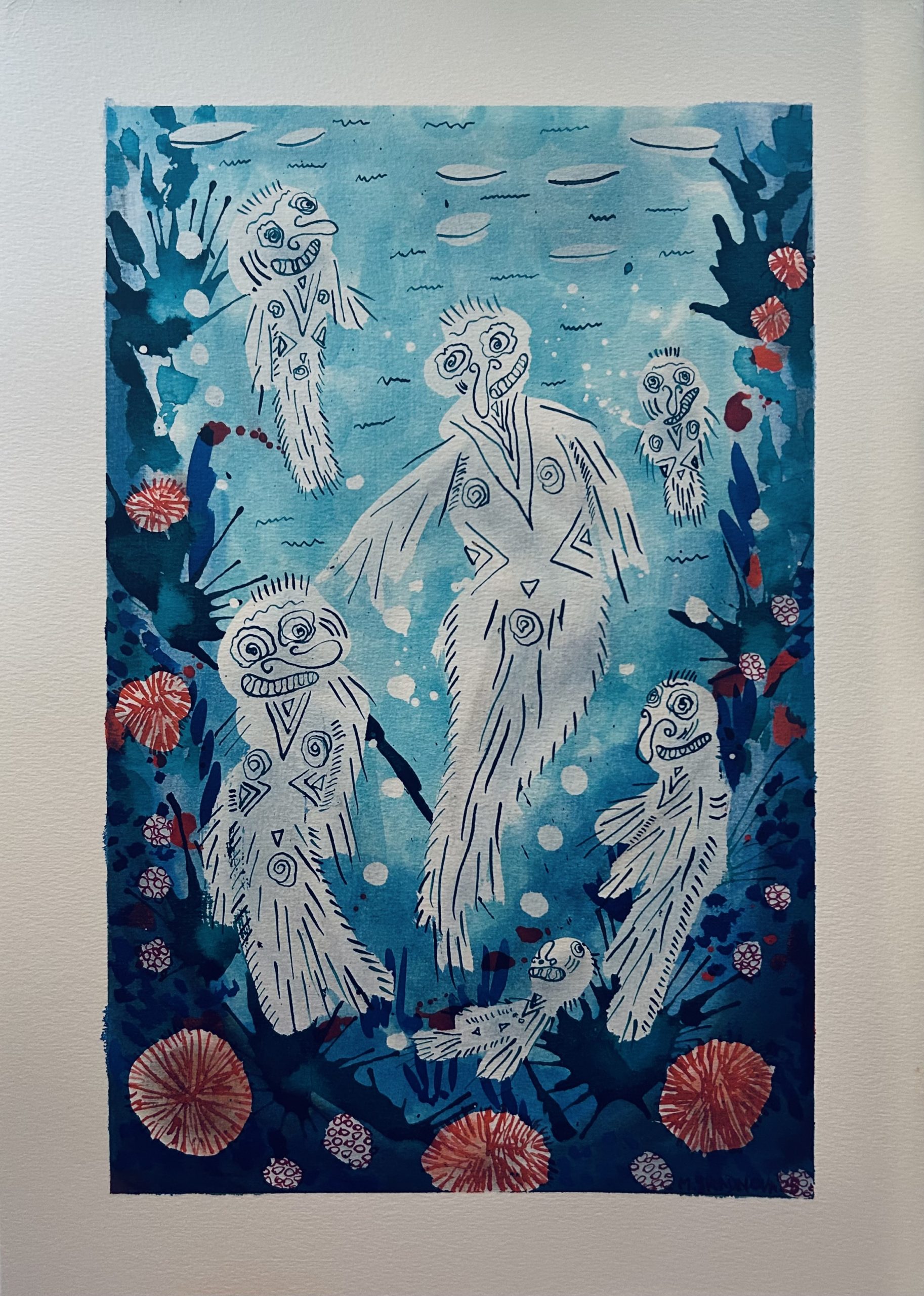 2025. Ink on paper. 420mm x 295mm. A powerful visual narrative of vanished coastal communities and lost biodiversity, portrayed through a fusion of ghostly human figures interwoven with marine species. These spectral beings—fishermen, children, coral reefs—float in the depths, their outlines dissolving into water. Ink drips like oil spills, forming a dialogue between destruction and resilience. Bioluminescent accents illuminate symbols of rebirth, from new coral growth to rising kelp forests. « What vanishes, lingers. This piece reminds us of what we have lost and what we still have the power to protect ».