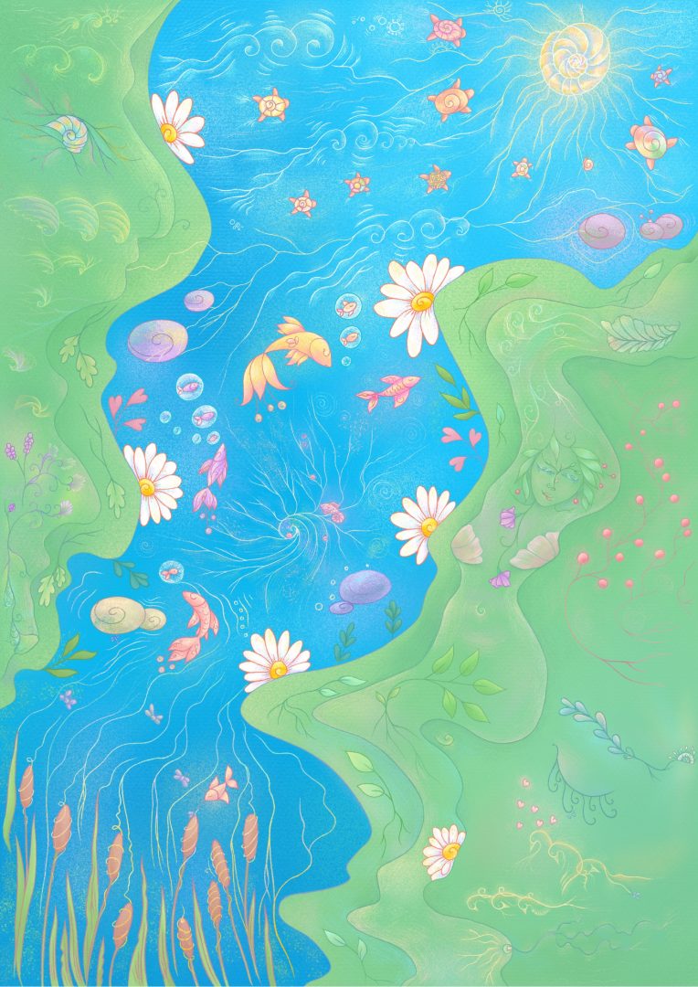 This digital painting offers a symbolic vision of ocean harmony, where aquatic life, glowing threads, and human forms are interconnected. A golden fish, ammonite, turtles, and sea plants form a mythic landscape of resilience and renewal. Inspired by storytelling traditions, the piece invites viewers to emotionally reconnect with nature and recognize their role in ocean preservation and collective healing.