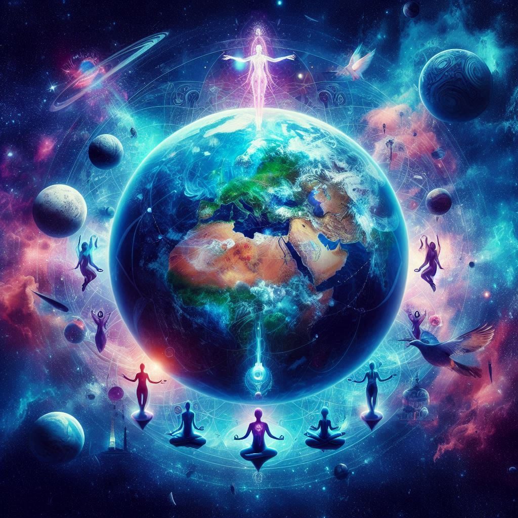 The image portrays Earth amidst a cosmic backdrop, encircled by celestial beings radiating energy towards the planet, symbolizing unity and collective harmony. It emphasizes spiritual healing and interconnectedness to nurture ocean health and planetary well-being.