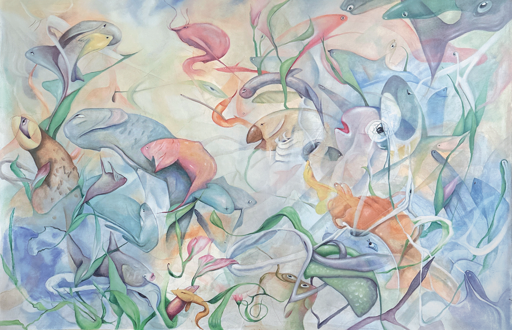 "Social Soup" is a transparent, almost watery oil painting on a loose canvas, designed to hang freely on a wall. Created through an intuitive process, the artwork emerged without a predetermined composition or figurative structure. Instead, it took shape organically, guided by the artist’s subconscious. The process began with chaotic lines, allowing intuition to reveal hidden forms—just as life in the ocean evolves without force. Creatures emerge, merge, and transform, existing in a fluid symbiosis with their environment. Upon closer inspection, a surreal underwater world unfolds, where beings intertwine and dissolve into one another, blurring the boundaries between individuality and coexistence.
