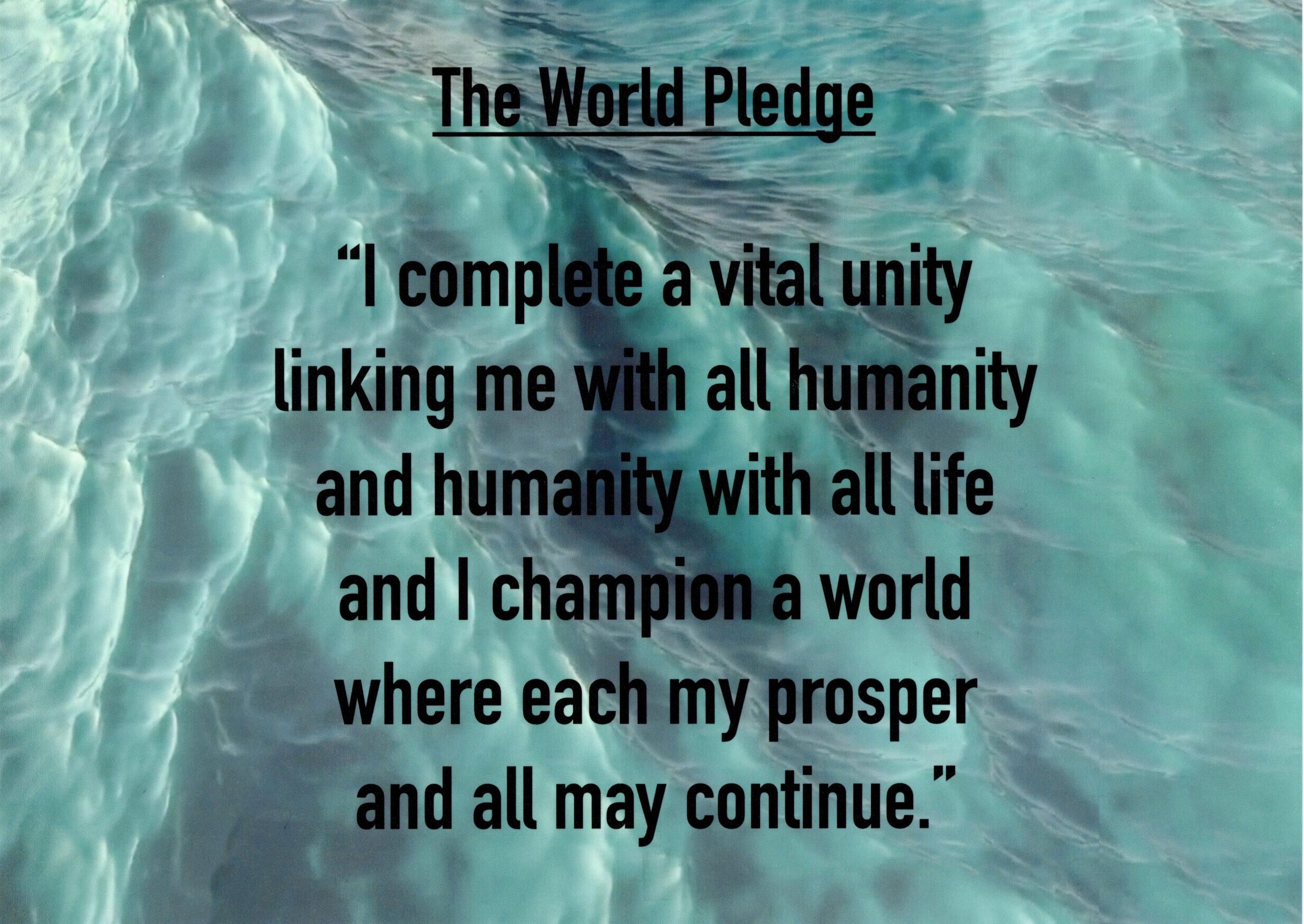In this art piece, I envision a world pledge as being adopted worldwide, perhaps included in children's schools as a wall plaque, a lesson plan, or a daily recitation. We need to treat ourselves and our planet better. More effective than laws are the values we internalize. Instead of fighting a myriad of injustices one by one, we can foster the mindset that tolerates none. If you want change, aim high and start low—with the children.