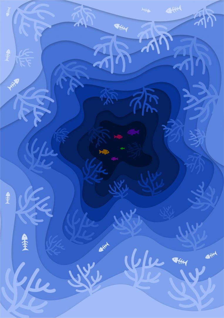 This digital graphic depicts coral bleaching across ocean depths. Shallow waters show ghostly white corals, symbolizing rising temperatures. Deeper reefs retain color but face growing threats. The contrast warns of a fading ocean, urging action to protect these vital ecosystems.
