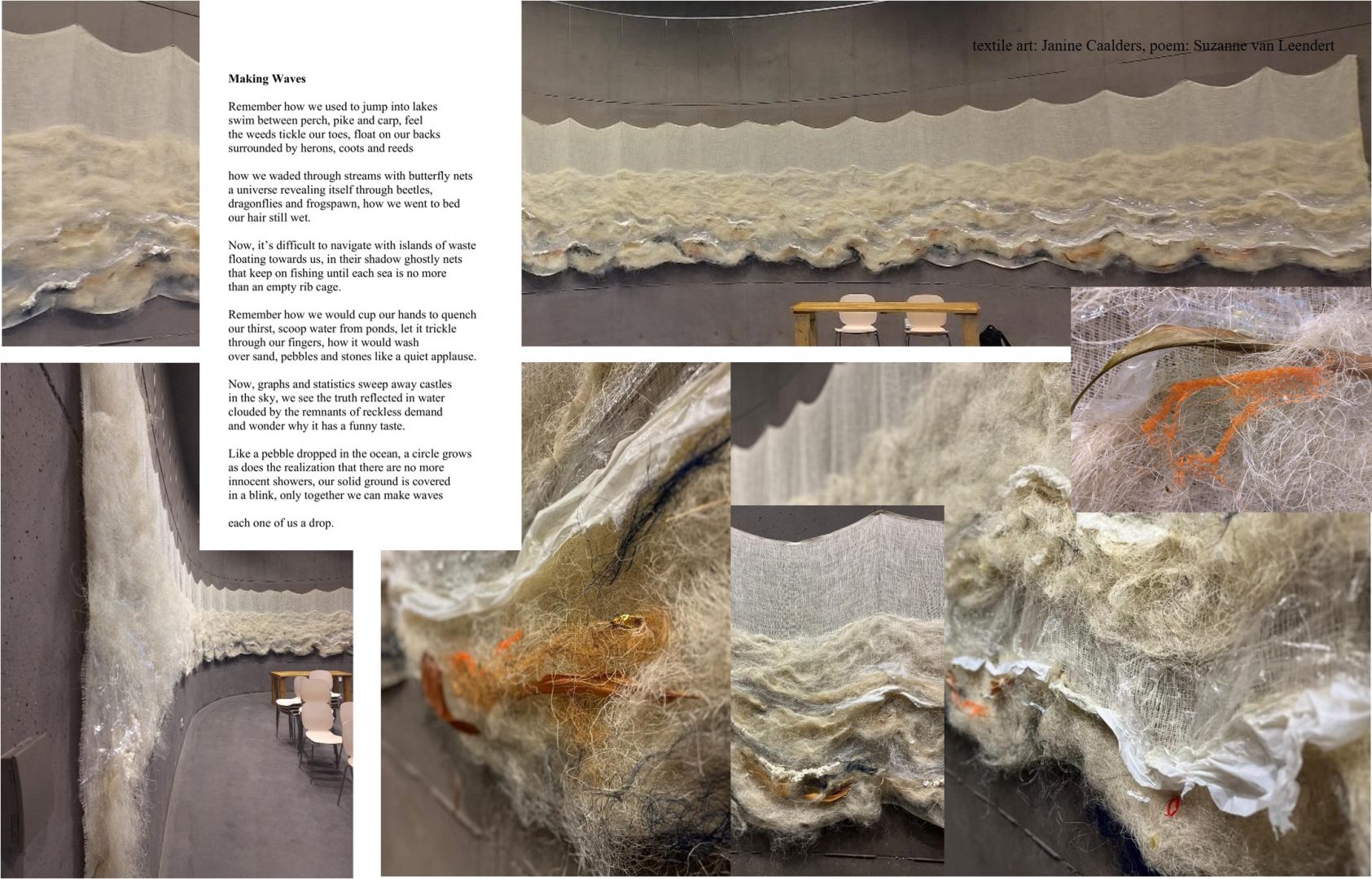 "Making Waves" – a fusion of textile art and poetry – invites reflection on our relationship with water: what it holds, what it means to us, and how we use it. Currently on display at the Waterliniemuseum in the Netherlands as part of the exhibition Still Waters, this work integrates jute with everyday discarded materials such as plastic packaging, bottle caps, and sealing clips—items often ignored but frequently polluting our seas. By repurposing these materials, the piece urges viewers to consider their role in water contamination and the pervasive presence of plastics, even in textiles. It evokes both beauty and dismay, mirrored in the accompanying poem, which emphasizes our shared responsibility and the fact that we all belong to the same ‘tribe’: "Only together we can make waves / each one of us a drop." "Making Waves" connects to water quality discussions and initiatives like The Ocean Cleanup, balancing the vast beauty of nature with the stark reality of human impact.