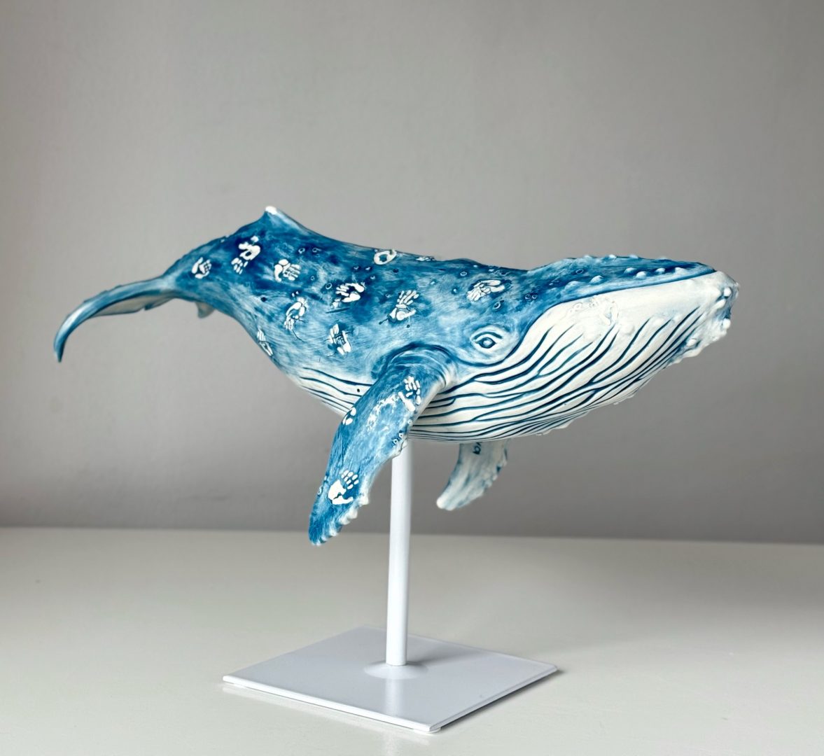 A porcelain humpback whale bears human handprints across its body. These marks represent our impact—both tender and destructive—on ocean life. The sculpture captures a moment of stillness, asking whether our presence is a gesture of care or a scar of harm. This work reflects the fragile bond between humans and marine life, calling for awareness, healing, and collective responsibility