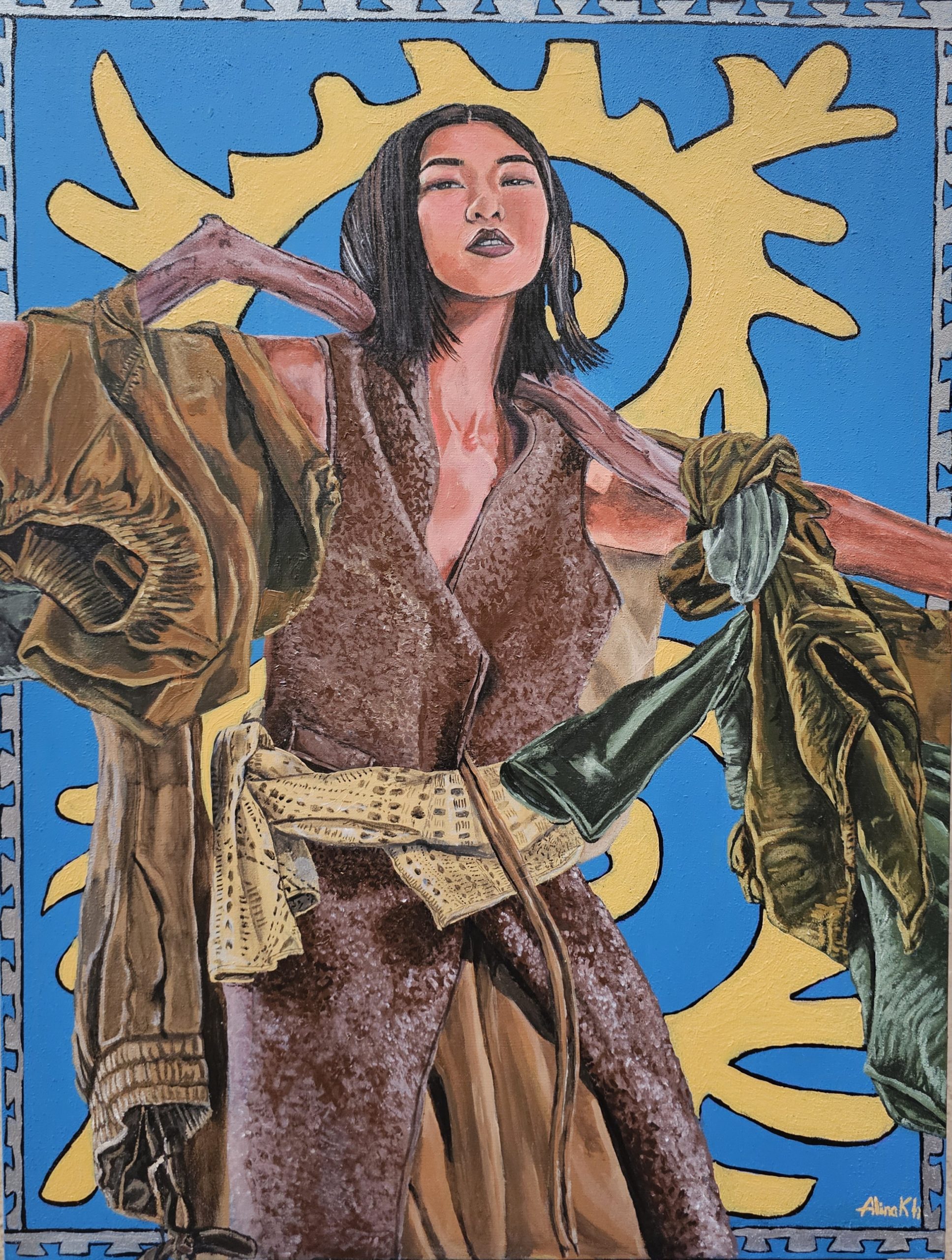 This painting reflects the Kazakh people’s sacred bond with nature, now strained by modern overconsumption. I embody nature’s spirit, burdened by a wooden staff laden with earthy-toned garments (wool, linen, cotton)—symbolizing humanity’s excess. The tekemet-patterned background, with its blue sky and sun-yellow ornaments, evokes tradition and balance. Through this visual metaphor, I urge reconnection with ecological harmony before the weight of exploitation becomes irreversible. The work challenges viewers to reflect on their environmental impact and reclaim stewardship of the natural world.