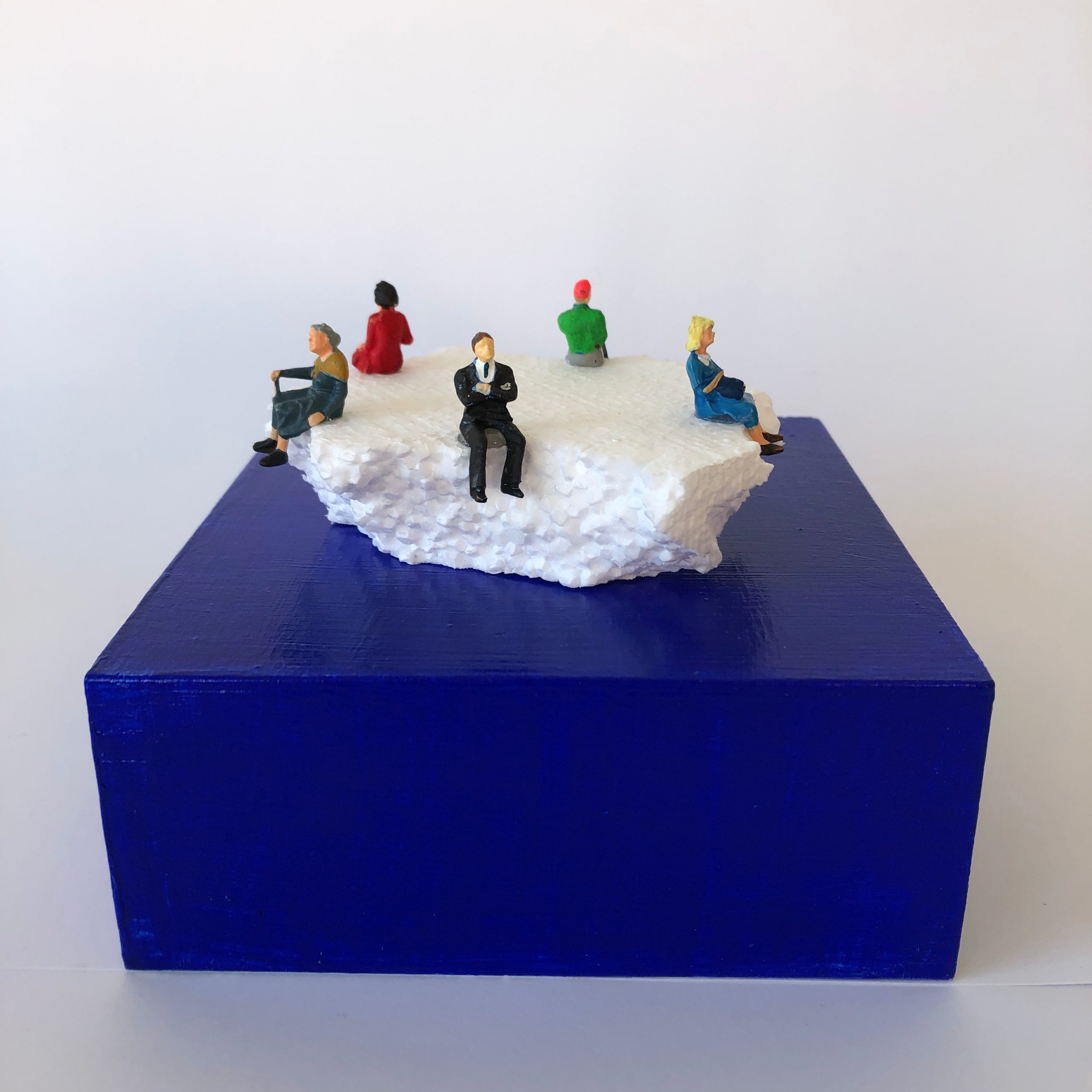 As an artist and former oceanographer, I find it frightening how long it takes to translate research findings into political and human action. The warming of the oceans as a result of man-made global warming has an enormous impact on the ecology and circulation of the oceans. Although we know the connections, we are failing to change our thinking. Waiting and sitting it out is not a solution, but I would like to dramatize this with my object. Small figures sit on the edge of an ice floe in everyday clothes, what are they waiting for? Object is made of wood box, styrofoam, model figures, acrylic paint. Height 12 cm, width 15 cm, depth 15 cm, 2025