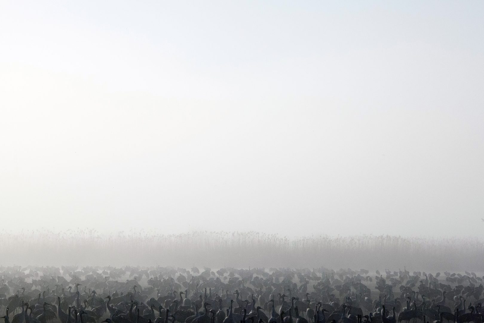 Common cranes used to migrate from Europe and Asia to Africa in autumn and back in spring. Many of them would stop for a break at the Hula (a small lake located in the north of Israel) and resume their journey the following day. As the lake’s surrounding is replete with agriculture (such as corn and fish), the cranes used to feast on them and continue on their way. In order to save the crops, the cranes are now fed proactively, every morning. As a result, the cranes stopped causing damage to nearby agriculture, but many cranes are now addicted to the food provided to them and prefer to stay in the area in the winter, rather than resume their migration to Africa. In the winter of 2021-2022 the cranes were plagued by bird flu. Due to so many cranes being packed into close quarters, roughly 10,000 died. More photos from the series “Cranes”.