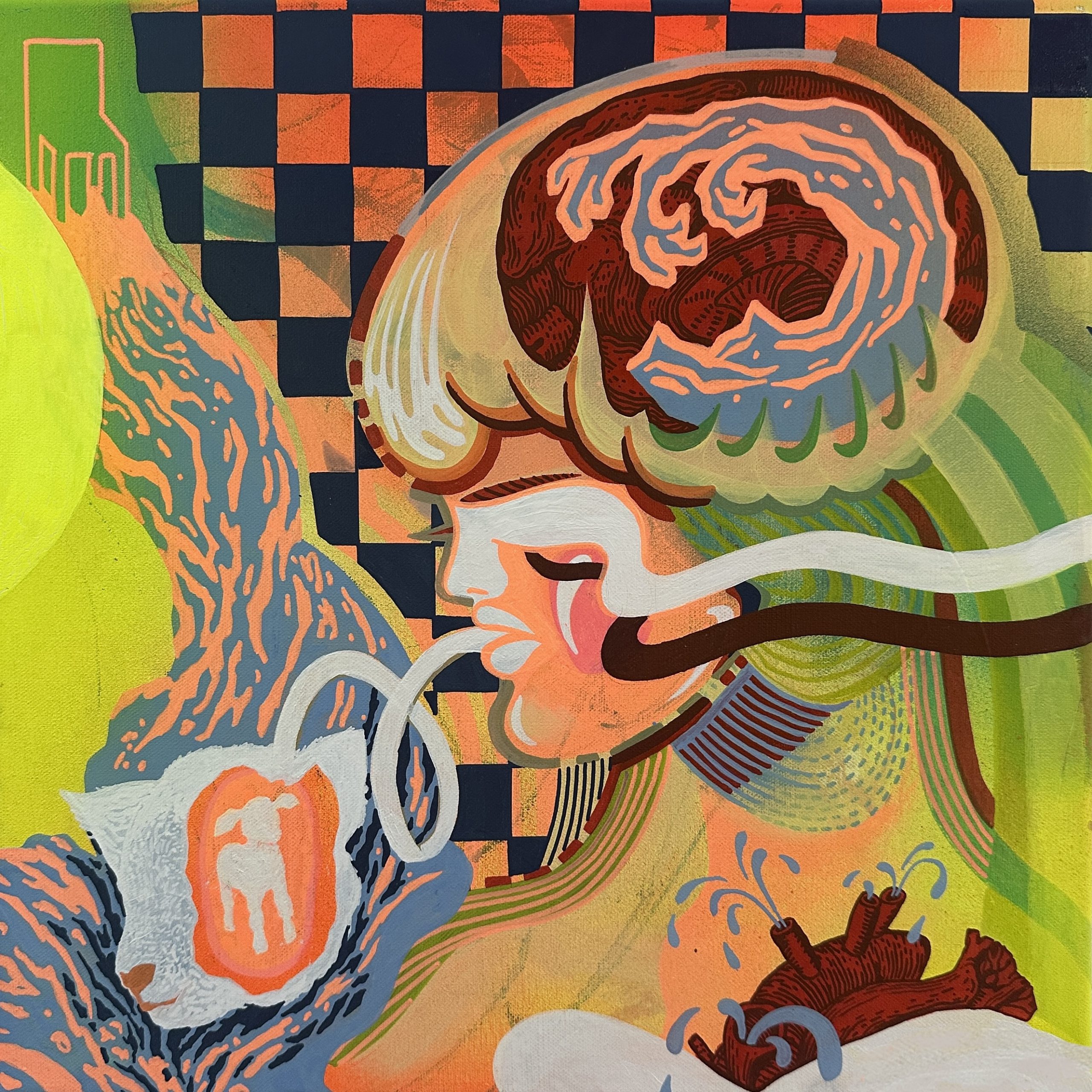 It is a symbolic vision of longing - for water, for purity, for a return to harmony. Just as we are drawn to breathtaking places during a honeymoon, we are drawn to water. The central figure, a woman with a bridal aura, leans toward a shared stream with a lamb. Their simultaneous drinking speaks to a primal kinship between humans and animals. The lamb, symbol of purity and vulnerability, reflects our own fragile hope that what we consume will be clean, nourishing, and justly given. The ocean-like wave inside the woman’s head reminds us we are water -emotionally, biologically, spiritually. A towering chair looms in the background - a metaphor for authority. Is it divine provision or institutional control? Who truly governs our access to water: nature, the state, or the private sector? The chair invites us to question the systems behind the source, exposing the tension between care and control, blessing and ownership.