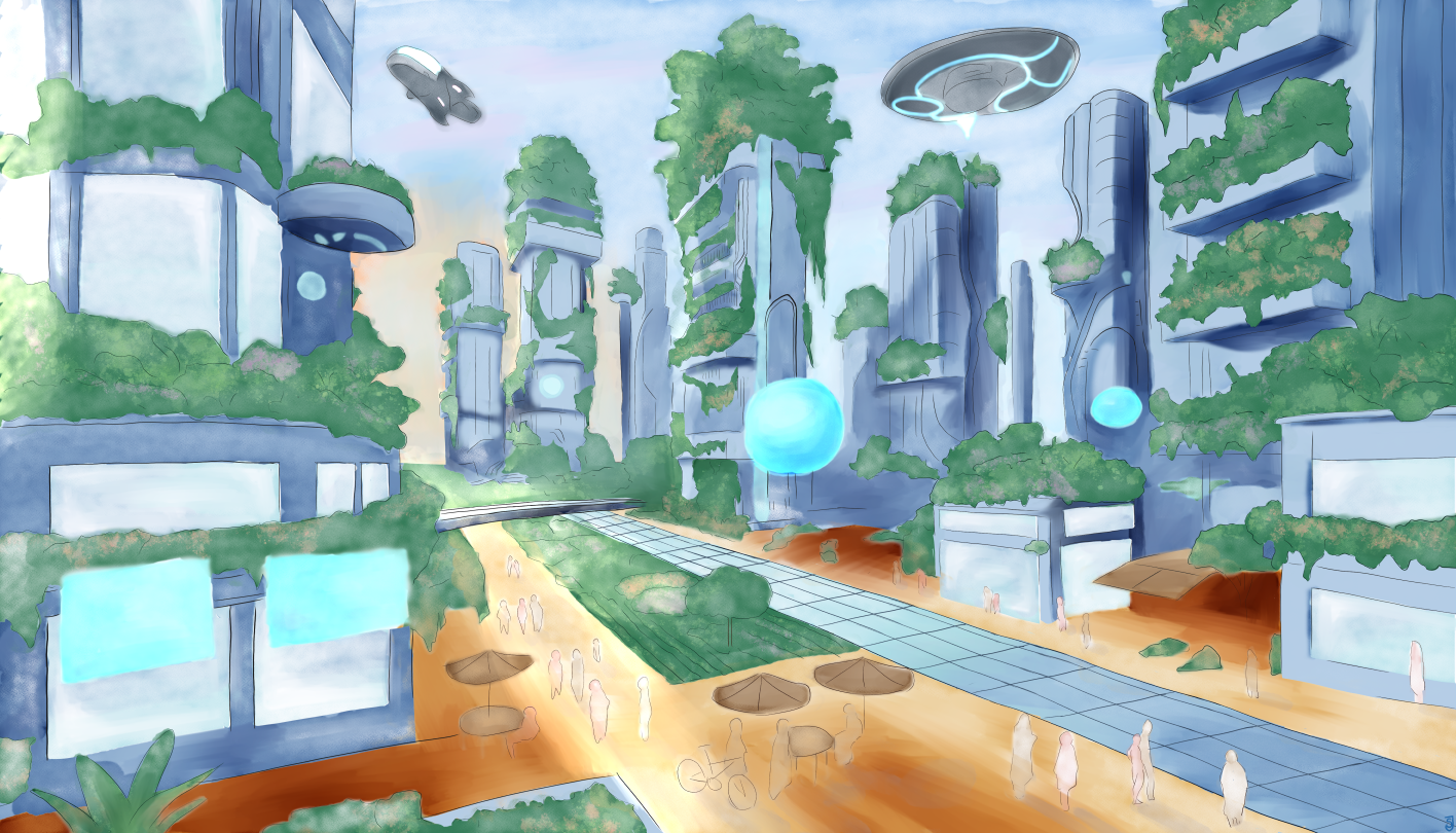 A futuristic cityscape thrives with greenery, hovering vehicles and soft light, blending technology with lush plant life.