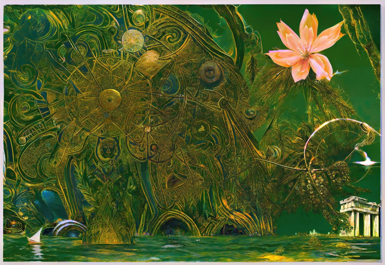 This explores the complexity of Computational Nature, where algorithms generate order from noise/chaos. This dense jungle, created via digital collage using woodcut methods—an analogy for physical carving introducing digital resistance—explores creative, ambivalent tension between controlled algorithms & unpredictable natural energy. Anchored in material reality by the giclée print, this garden offers a thinking/prayer space & circuit for self-encounter to navigate the future's hope and anxiety, prompting thought on our algorithms-interconnected future.
