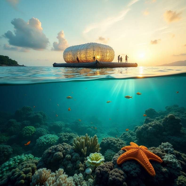 A pontoon created using recycled plastic bottles homes human beings above a thriving coral reef