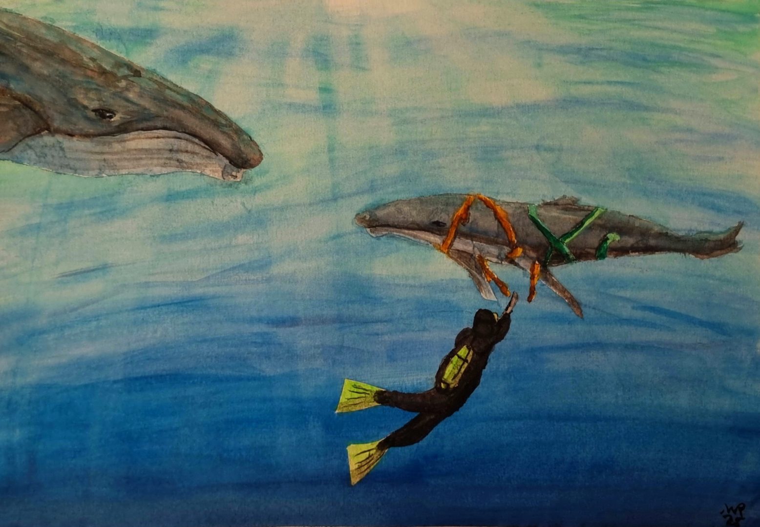 A water colour painting on watercolour paper depicting a human helping an entangled baby humpback whale whilst its mother observes.