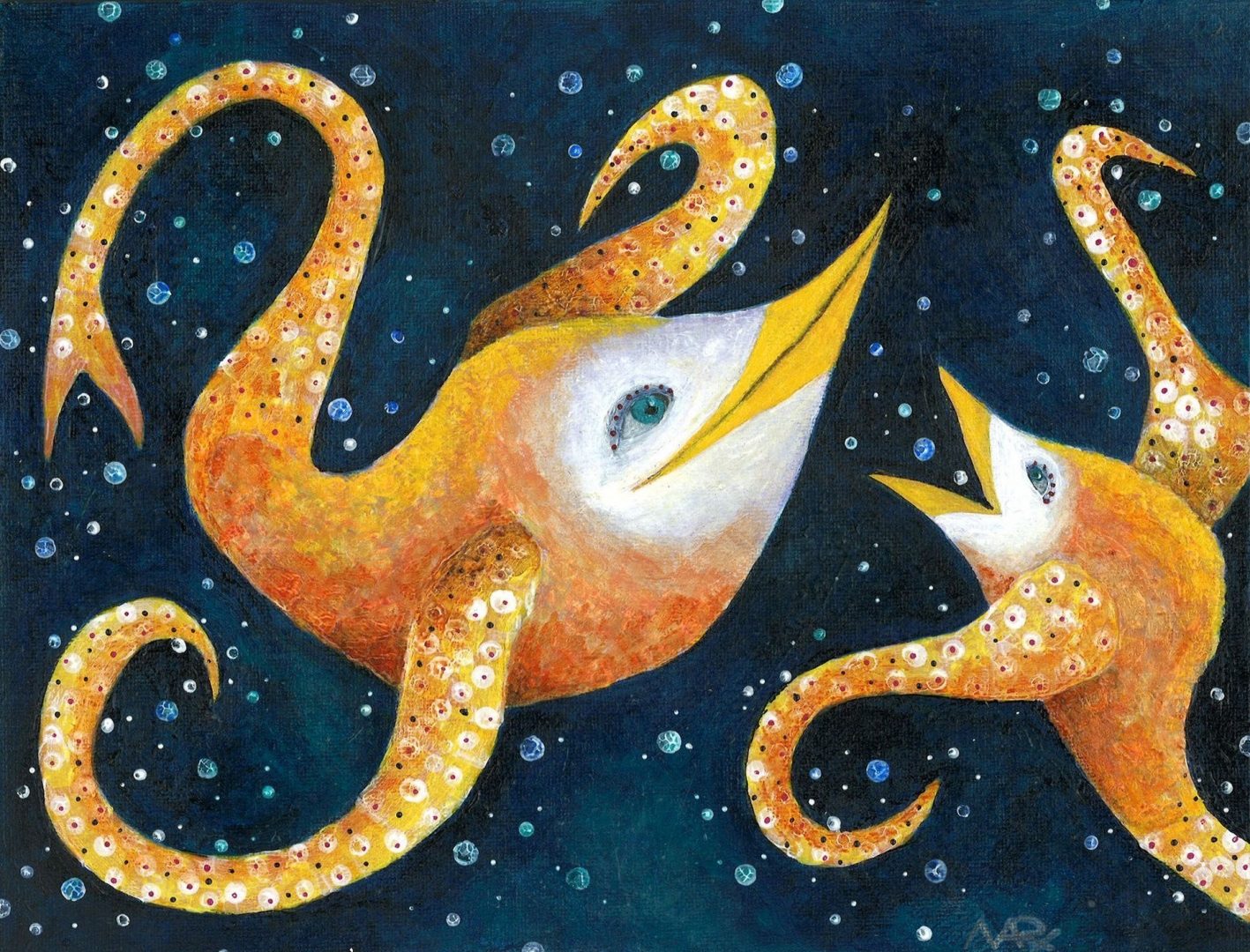 "Elbtoots" (Acrylic on Canvas, 30 cm x 22.5 cm) Are the Elbtoots creatures of my imagination, or a species that has emerged due to changes in the environment? It is said that the Elbtoots owe their name to beeing born in the Elbe River. When they communicate, their sound resembles the trumpeting call of cranes. They are said to live at the bottom of the river, where they are safe from marine traffic. Following the last mating season, the male Elbtoots are said to have swum to Cuxhaven and from there to the sea, searching for a cleaner and quieter habitat than the Elbe. Meanwhile, the females gave birth to their young. Since then, they have been waiting for a sign from their males, indicating that they can follow them to their new, beautiful home. Night after night, when the Elbe is less trafficked, they rise to the surface of the polluted waters and call out to their males.