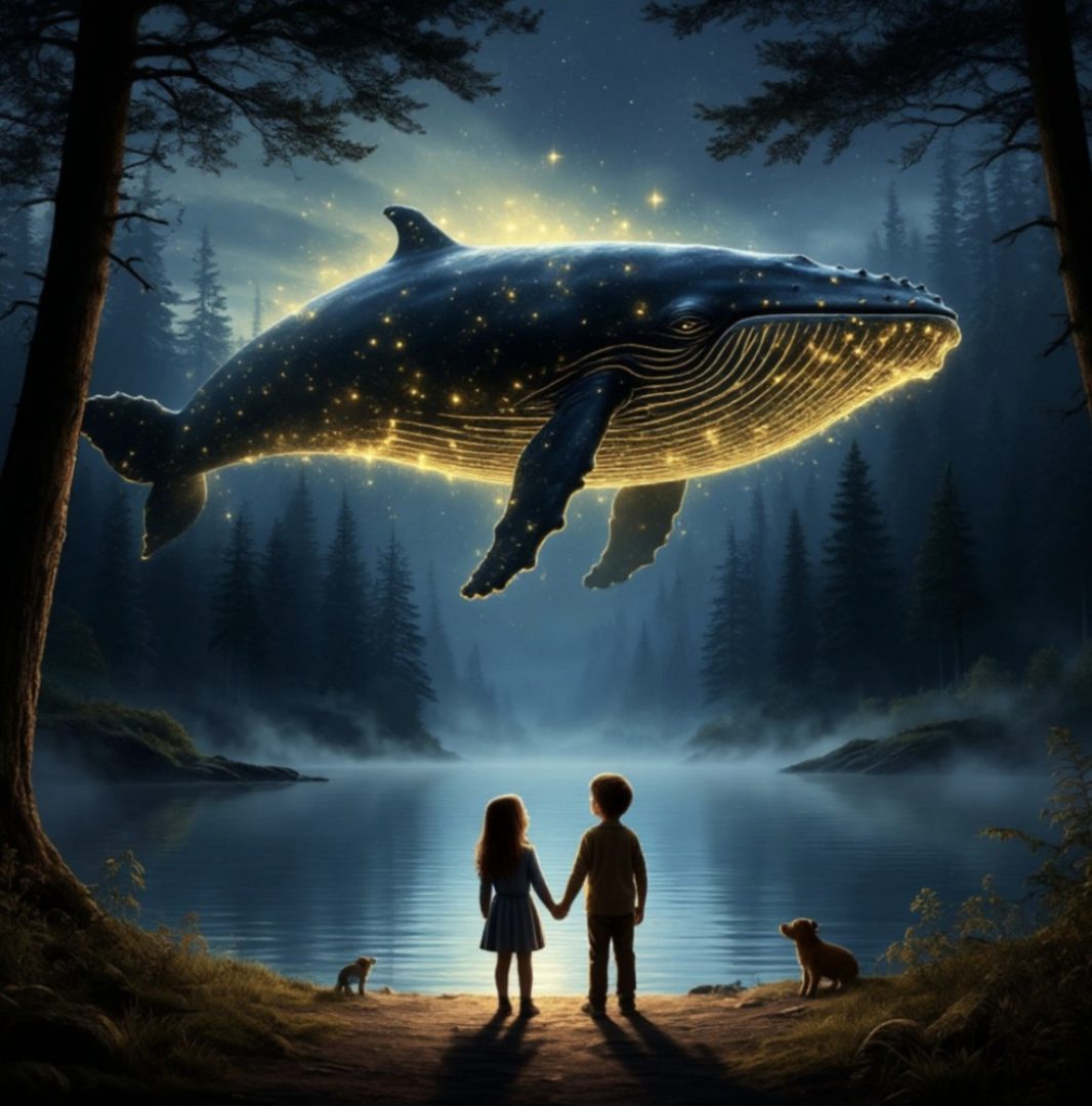 It will depict a view of the ocean at dusk, where vibrant blue and golden lights symbolize hope and new beginnings. The painting will be created in a style reminiscent of mystical imagery, with light emanating from the ocean as a symbol of healing. At the center of the composition, a giant glowing whale glides above the water, embodying the restoration of the oceans and their deep connection with humanity. This image is meant to inspire collective action to protect the oceans and restore ecosystems.