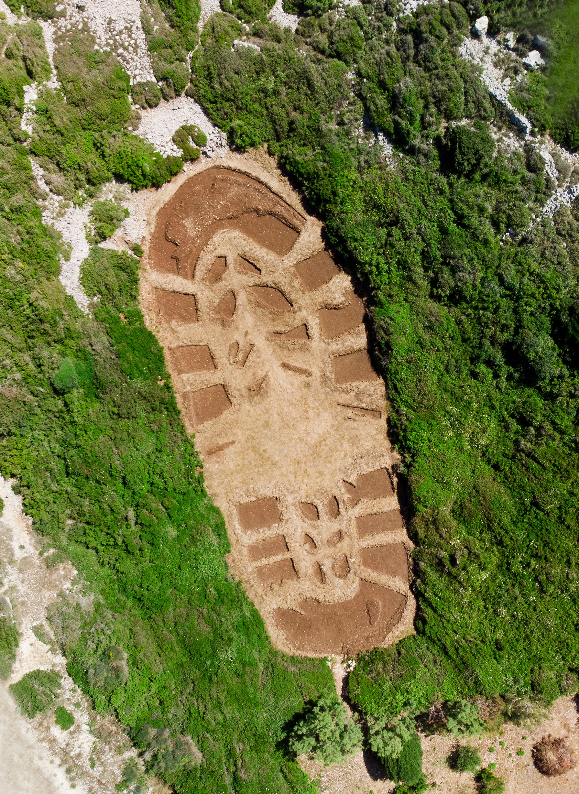 Footprint is a 1.000m2 land art which echoes that humanity continues to do more harm than good to nature. The artist used a big part of land as a canvas and worked in silence for 15 days with his bold and touching message in the island of Paxos in Greece. His artwork is spotlighting the urgent need for a balance between economic growth, social well-being and environmental conservation while the ongoing global situations continues to cast a shadow over global sustainable development discussions.