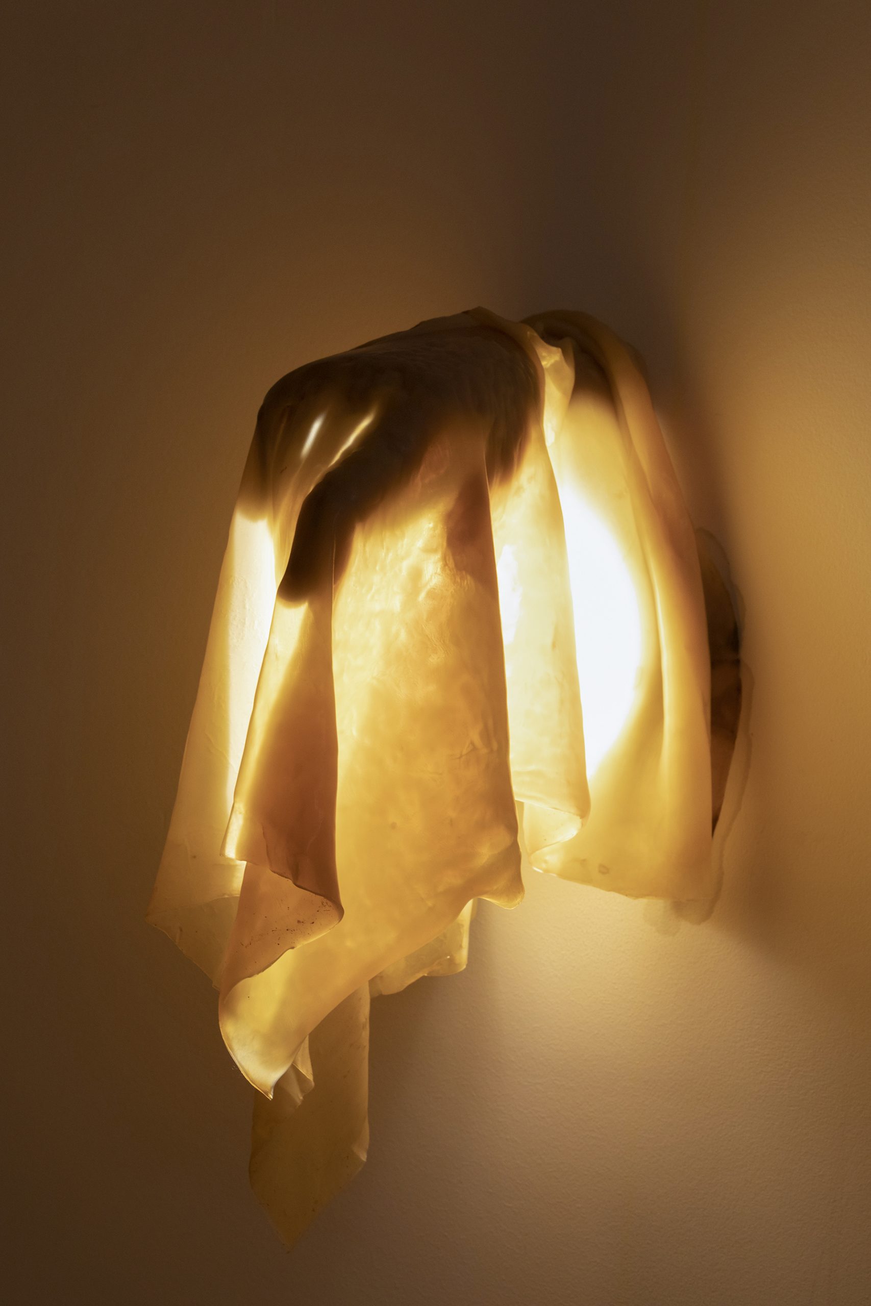 Meet 8 is an ambiental installation, which presents a new hybrid life form created from yeasts and bacterias. This artist-cultivated biological entity, manifested in cellulose, provides unique insights into our environment and its intricate processes. The material co-exists in a new habitat, which includes other microbes and organism. Due to various external influences, this work questions the next step of evolution and the coexistence of other life forms and creation. The installation is a speculative narrative, which steps into the hypothetical 8th day or era of creation, introducing both biological and artificial hybrids. It serves as a platform to ponder the possibility of new microbial life evolving symbiotically with humans for future protection. - http://adriennujhazi.com/projects/meet-8-2022/